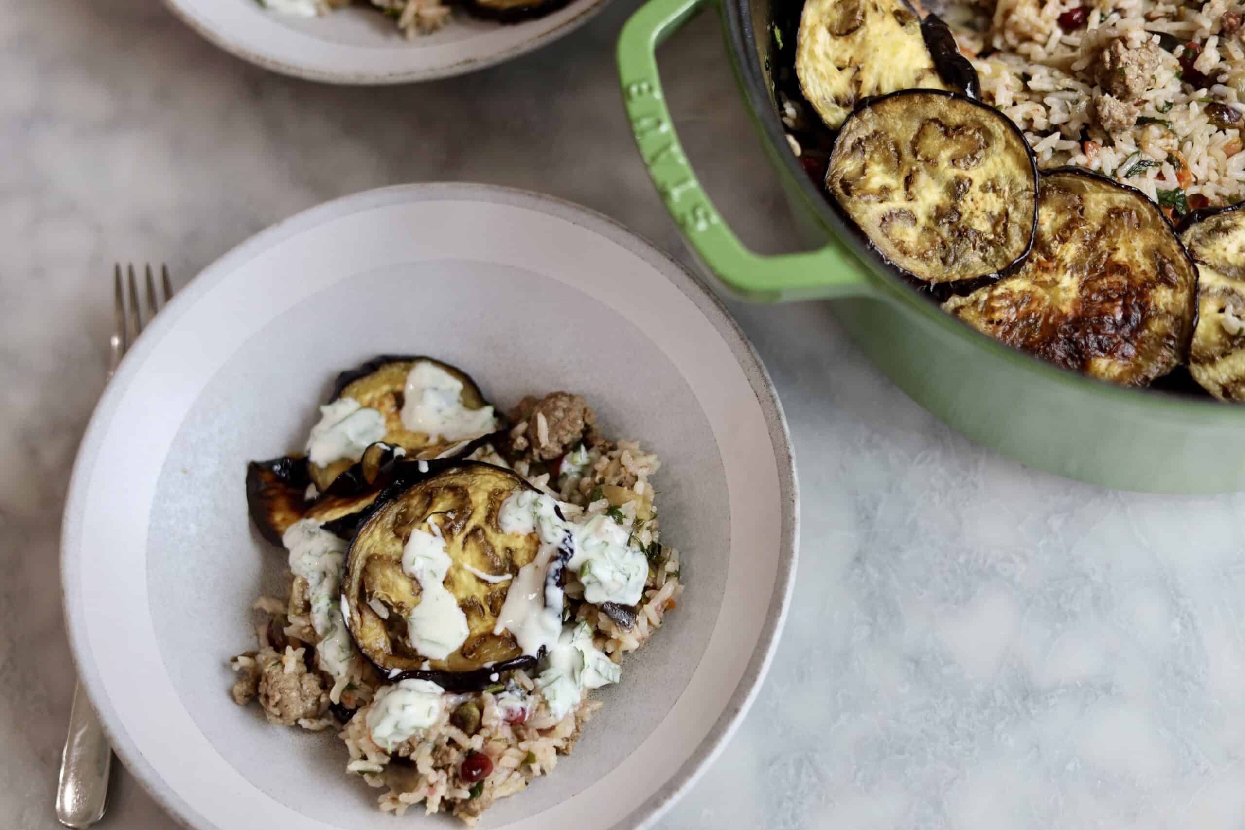 Mediterranean ground lamb and eggplant rice dish will become your favorite weeknight dinner. Fresh herbs and a yummy yogurt sauce make this dish a showstopper.
